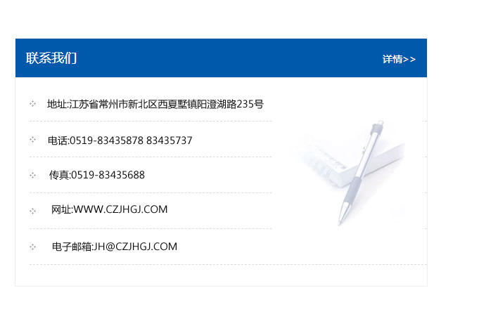 地址:常州市新北區友邦商務大廈1幢16、17層  電話:0519-85101652  傳真:0519-85112595  郵編:213022  網址:www.cz-jiayue_cn.hebxinda.com  郵箱:xiajifengaa@163.com